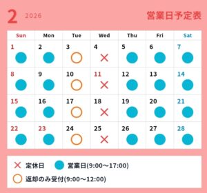 〇その他の営業日は 営業時間:9:00〜17:00(受付 9:00〜16:30)です。